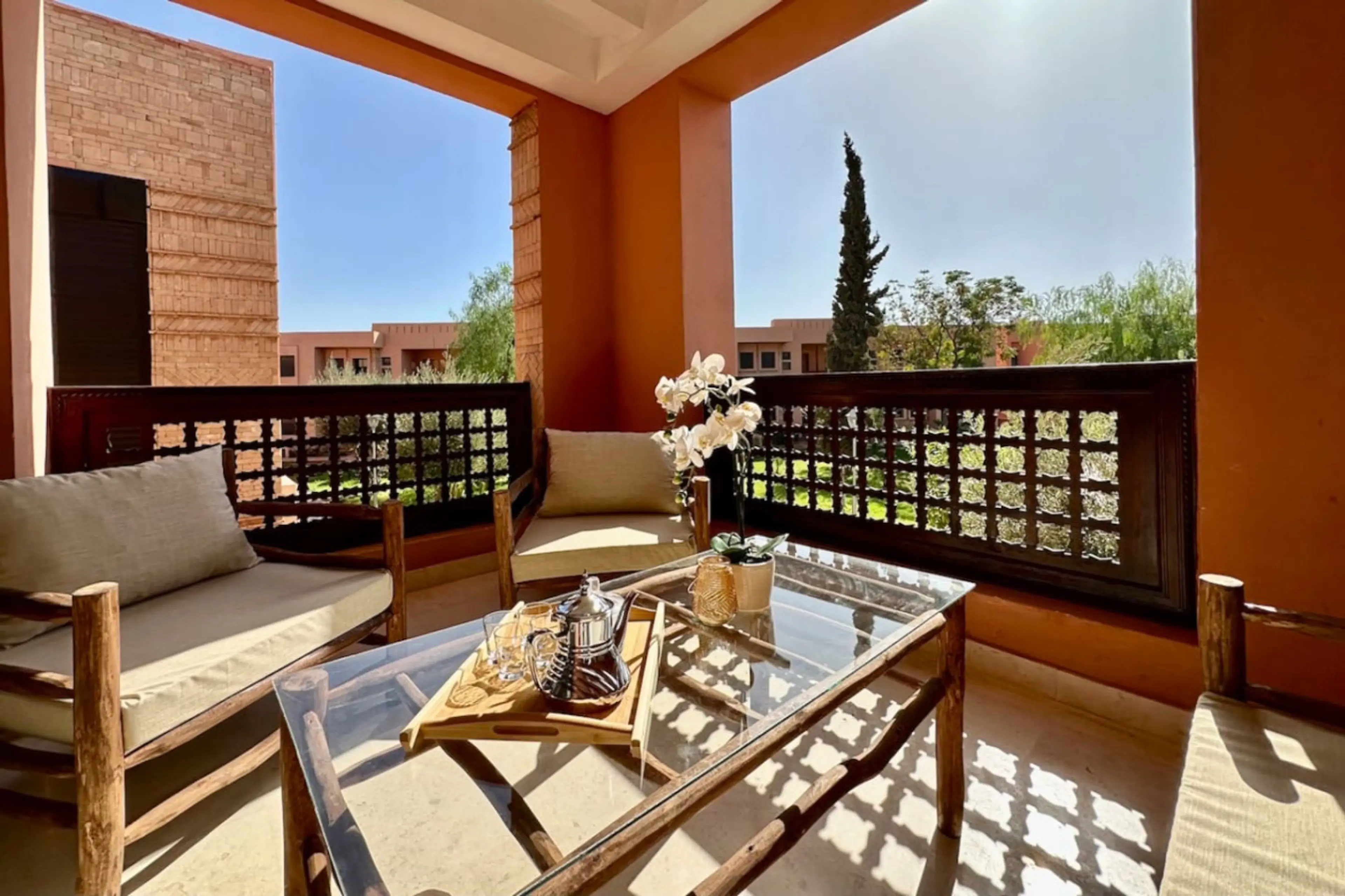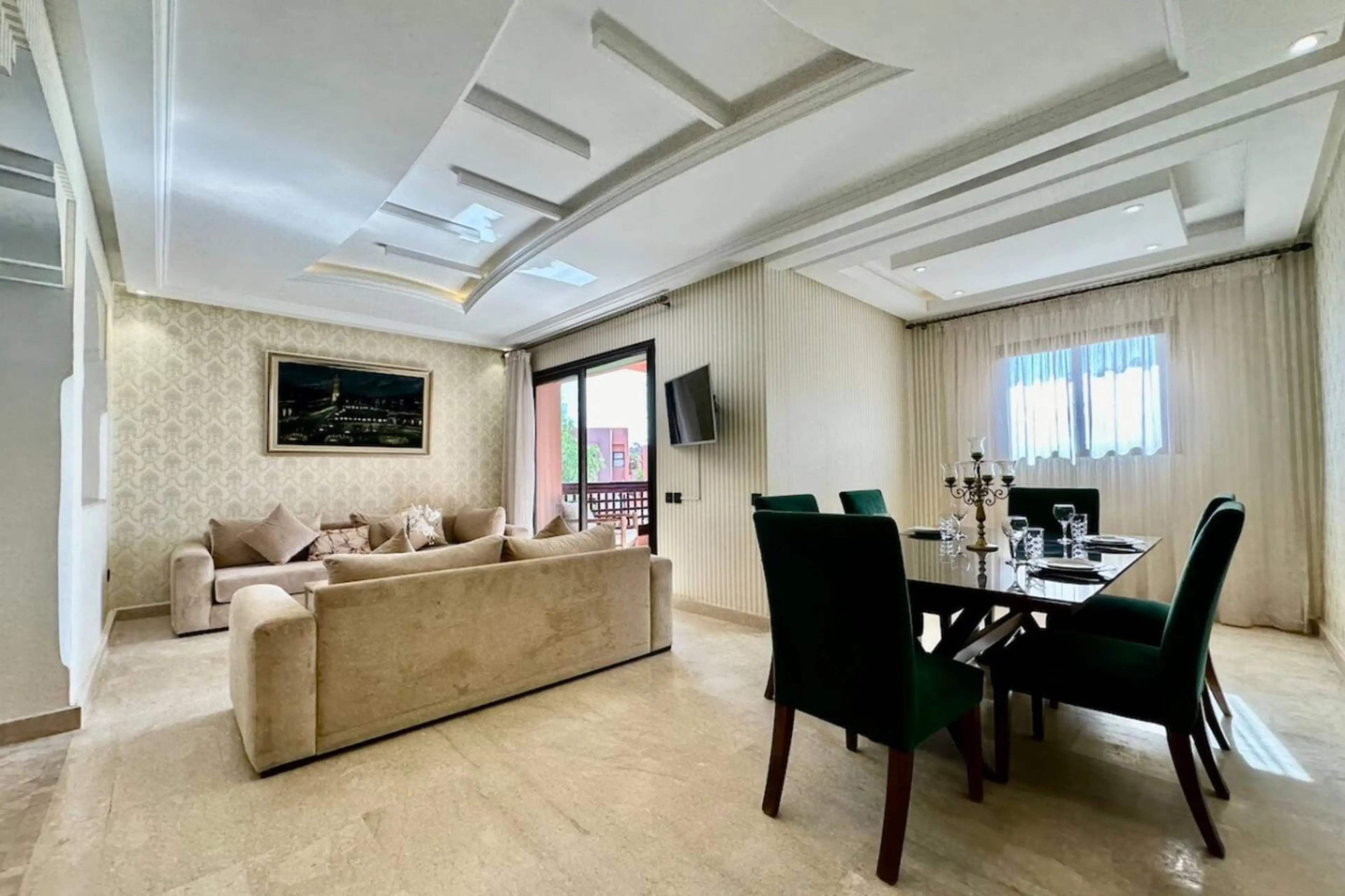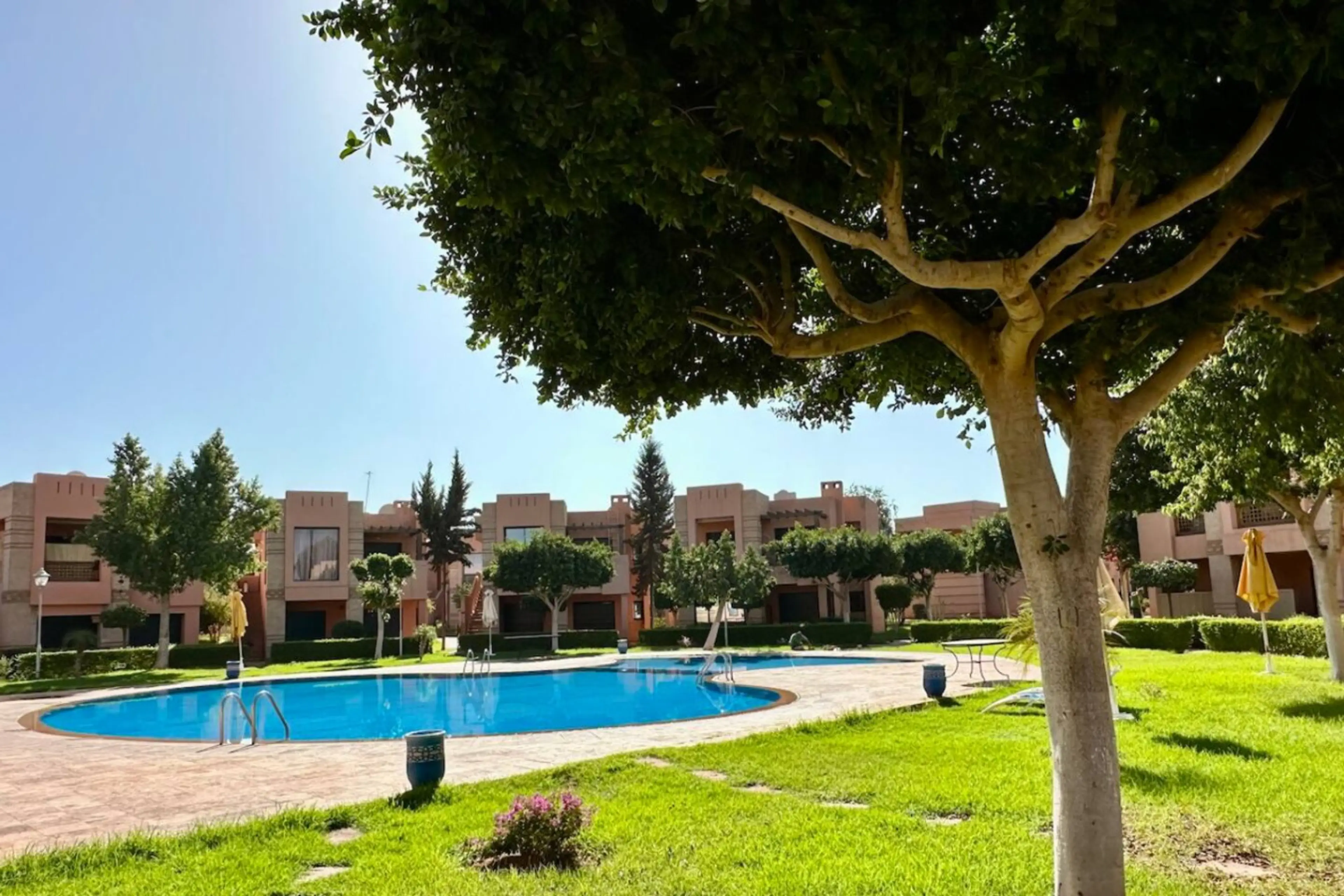 Beautiful two bedroom apartment in gated and secure residency with swimming pool, kids playground, foot court, underground parking and 24/7 security. Located just off the Road Ourika next to prestigious Dar Soukkar, BôZin where you can enjoy the show whilst having delicious dinner, within easy 5 mi...